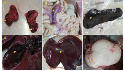 c: Lách sưng to, tụ máu, nhồi huyết; d: Túi mật sưng to